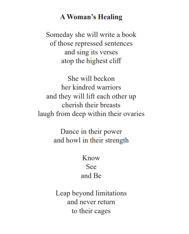 My poem “A Woman’s Healing” was published in the Winter 2020 Anthology from Other Worldly Women Press. Here it is, as seen in the anthology…